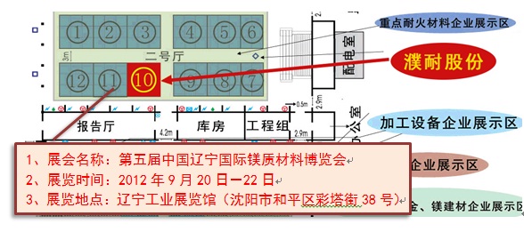 4、濮耐展台:濮耐展台面积为81平方,位于辽宁工业展览馆二号展厅重点耐材企业展示区十号展台。